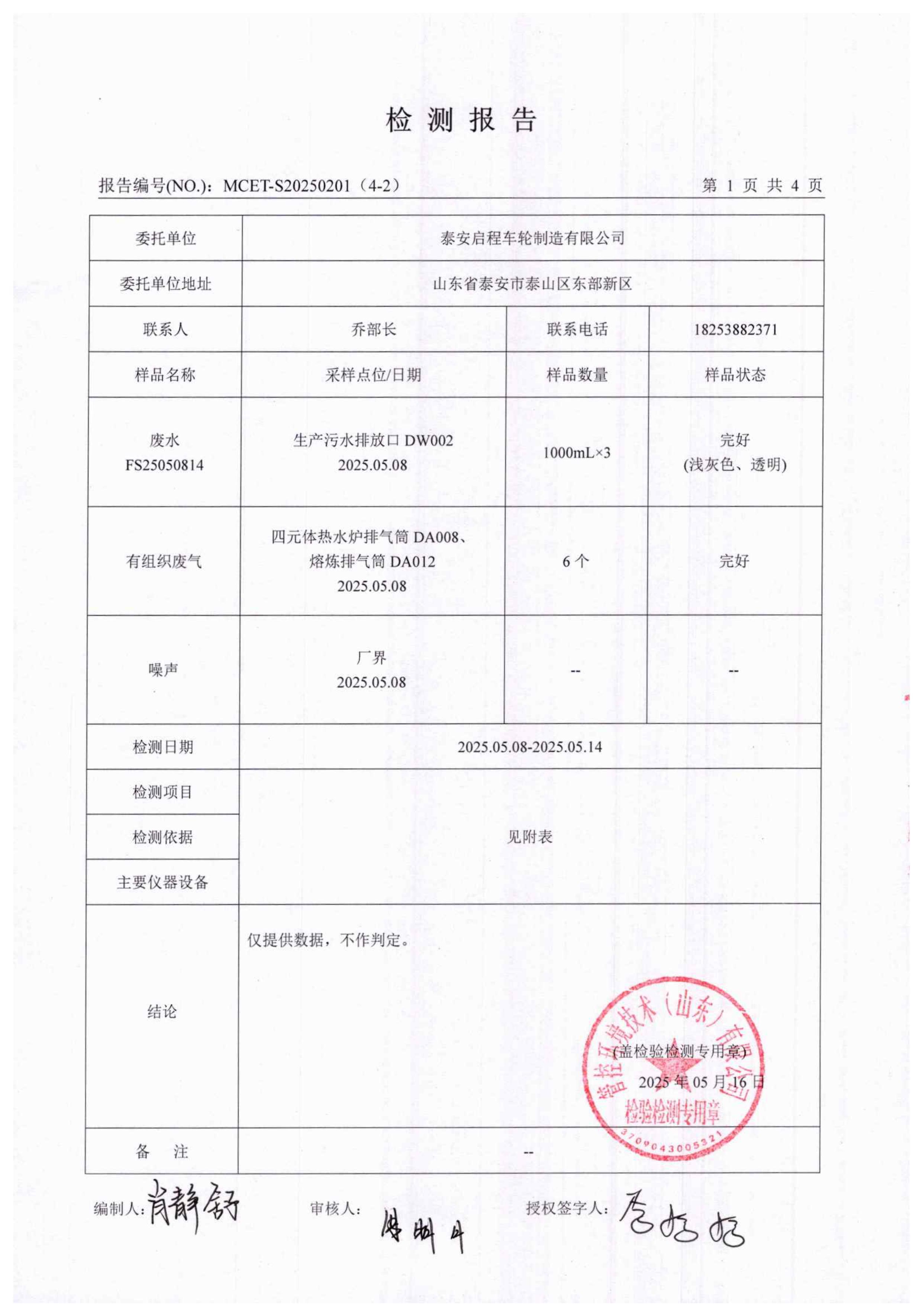 泰安啟程車輪制造有限公司2025年5月份環(huán)境污染物排放檢測報(bào)告