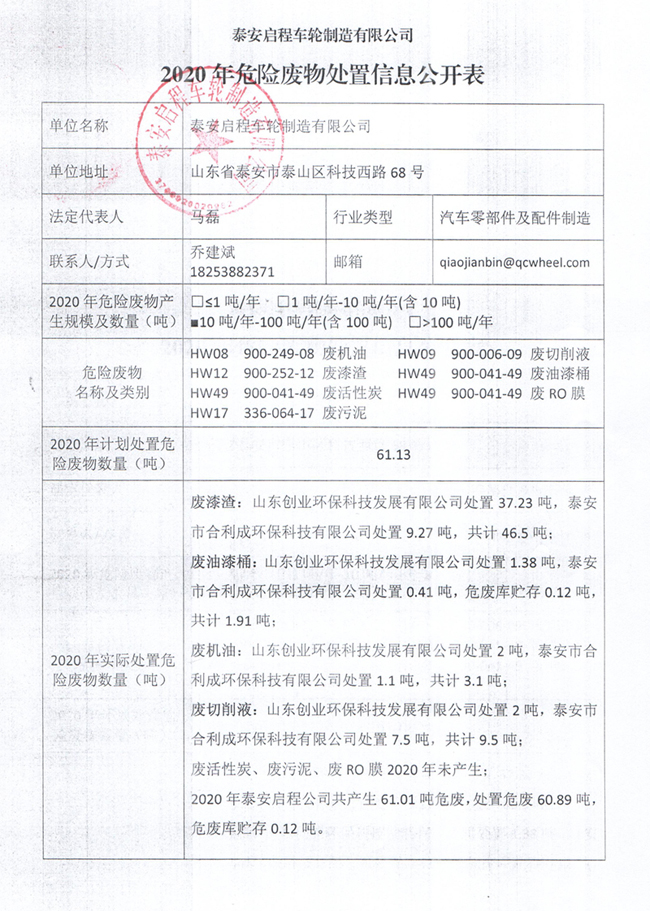 泰安啟程車輪制造有限公司危險(xiǎn)廢物處置信息公開