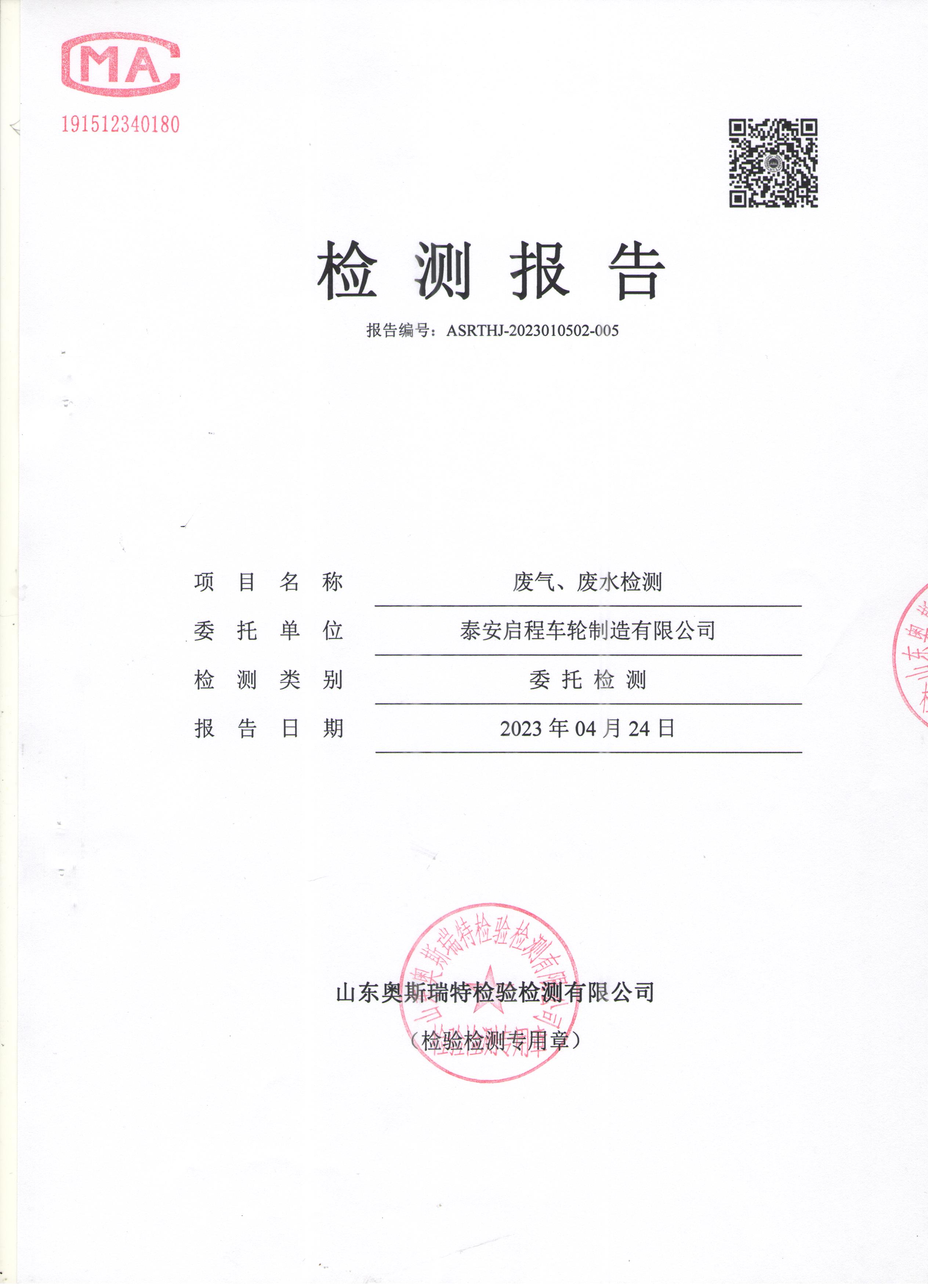 泰安啟程車輪制造有限公司2023年4月份環(huán)境污染物排放檢測(cè)報(bào)告