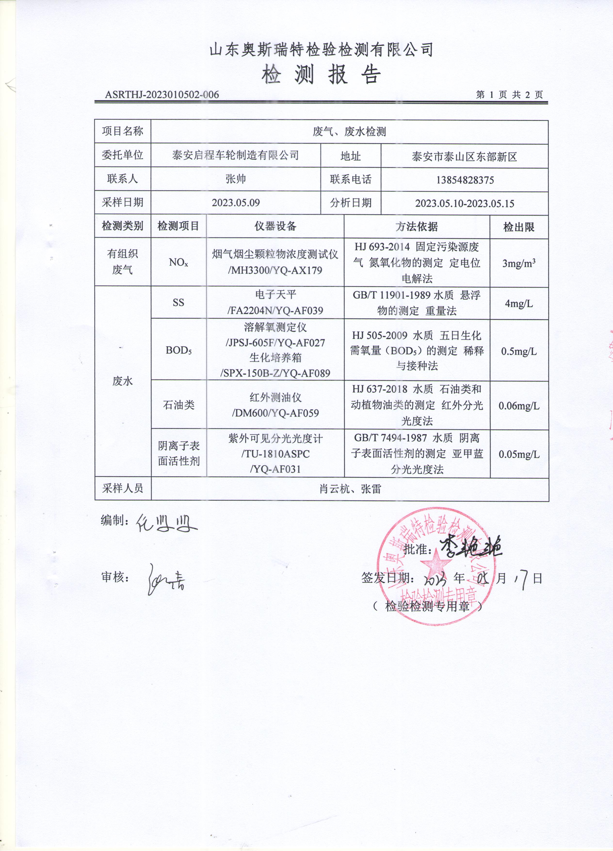 泰安啟程車輪制造有限公司2023年5月份環(huán)境污染物排放檢測(cè)報(bào)告